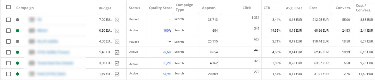 The Cost/Conversion ratio indicates the average amount of euros needed to acquire a purchase/booking. This number typically hovers around 5 euros, which our client is particularly pleased with as their service is sold within the range of 100-300 euros.